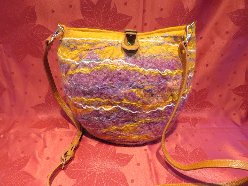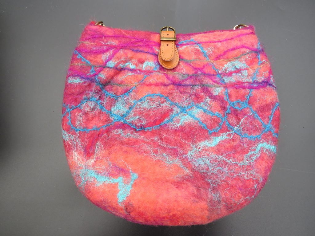 Beautiful wet-felted bag featuring a tan leather strap and magnetic clasp. A lovely mix of pink, orange, and purple, soft Perendale and Merino wools with mohair and silk embellishments. £45.00 Plus £3.50 UK P & P. Please click HERE for further details and link to purchase.