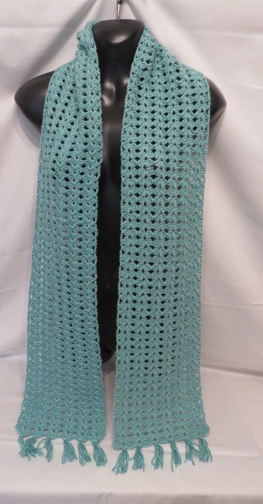 Handmade crochet summer scarf in a turquoise colourway. Soft and lightweight. £22.00 plus £3.50 UK P & P. Please click HERE for further details and a link to purchase.