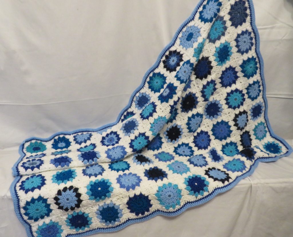 Handmade crochet blanket with a circles in squares design, white base with a variety of blue shades. Edged with a blue band. £40.00 Plus £3.50 UK P & P. Please click HERE for further details.