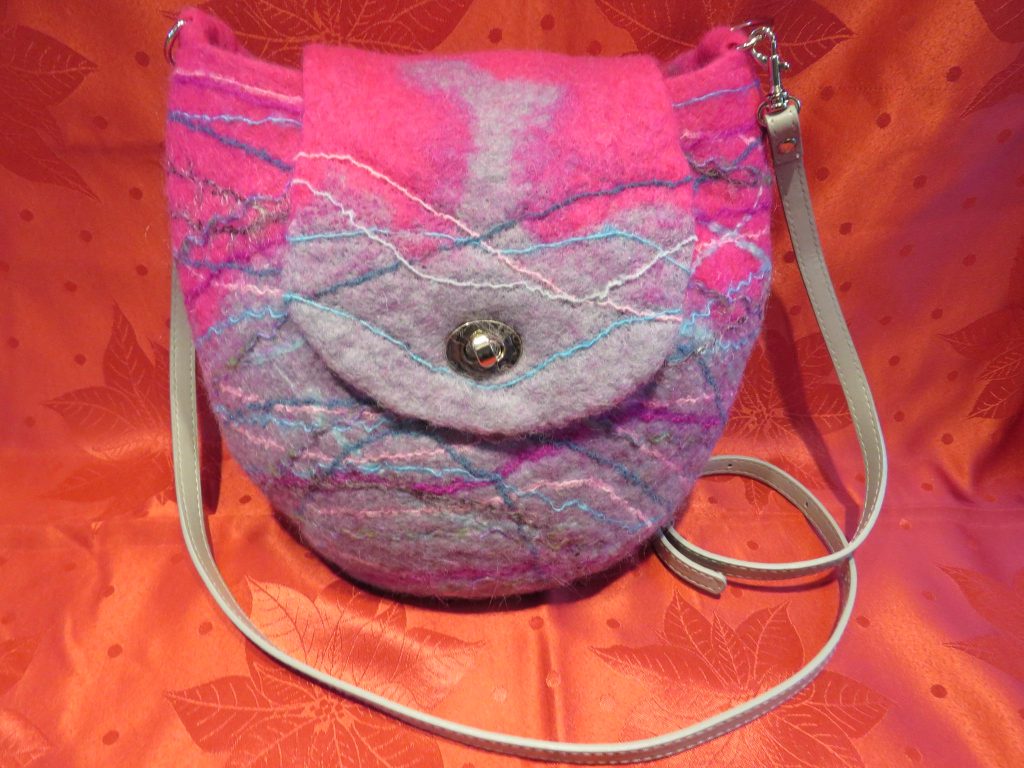Unique hand-felted cross body bag. Made using Perendale, Merino and Mohair wools, in a grey and pink colourway with blue embellishments. Features a turnbuckle clasp, a grey strap, silver coloured fittings and an internal pocket. Lovely gift idea. £45.00 plus £3.50 UK P & P. Please click HERE for further details.